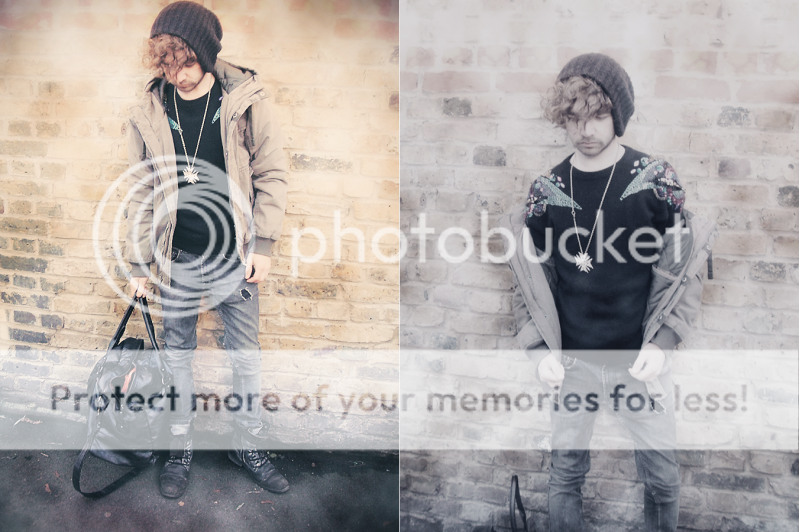 Something I've been desperate to parachute into my wardrobe for months is a crinkled canvas parka that becomes an inviting no-mans-land of layers to get lost in. I love how a rough and tumbled jacket can tame but equally enhance a jumper underneath that electrifies embellishments on the shoulder. I'm always one to sport a sequin, but it makes it even more refreshing to execute such a spark in a masculine manner, and I feel a parka jacket is just the ticket. Teamed with a beanie, military jeans and boots, it was the perfect daywear for a day in the city. I've included a few runway examples of this parka print that's ignited my inspiration, from Bottega Veneta to Wood Wood. And I also need to leave a huge thanks to Kyle from lookbook for editing my image below; his own personal style can be found at http://lookbook.nu/kylejammeson